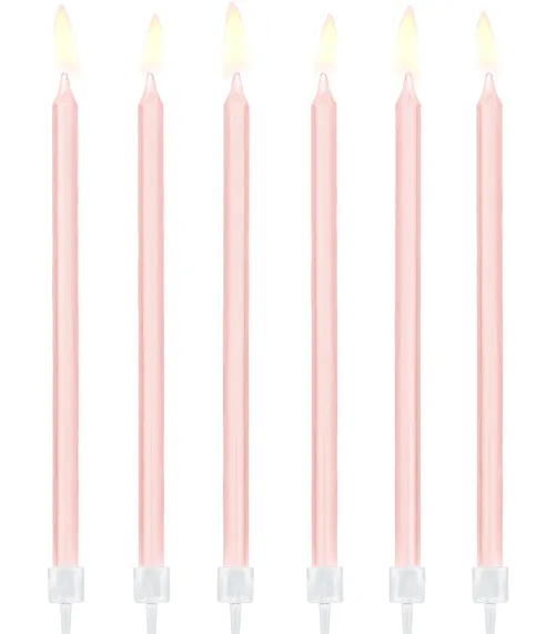 Popis: obyčajné narodeninové sviečky svetloružovej farby, výška cca 14 cm. Sada obsahuje 12 sviečok a držiakov.